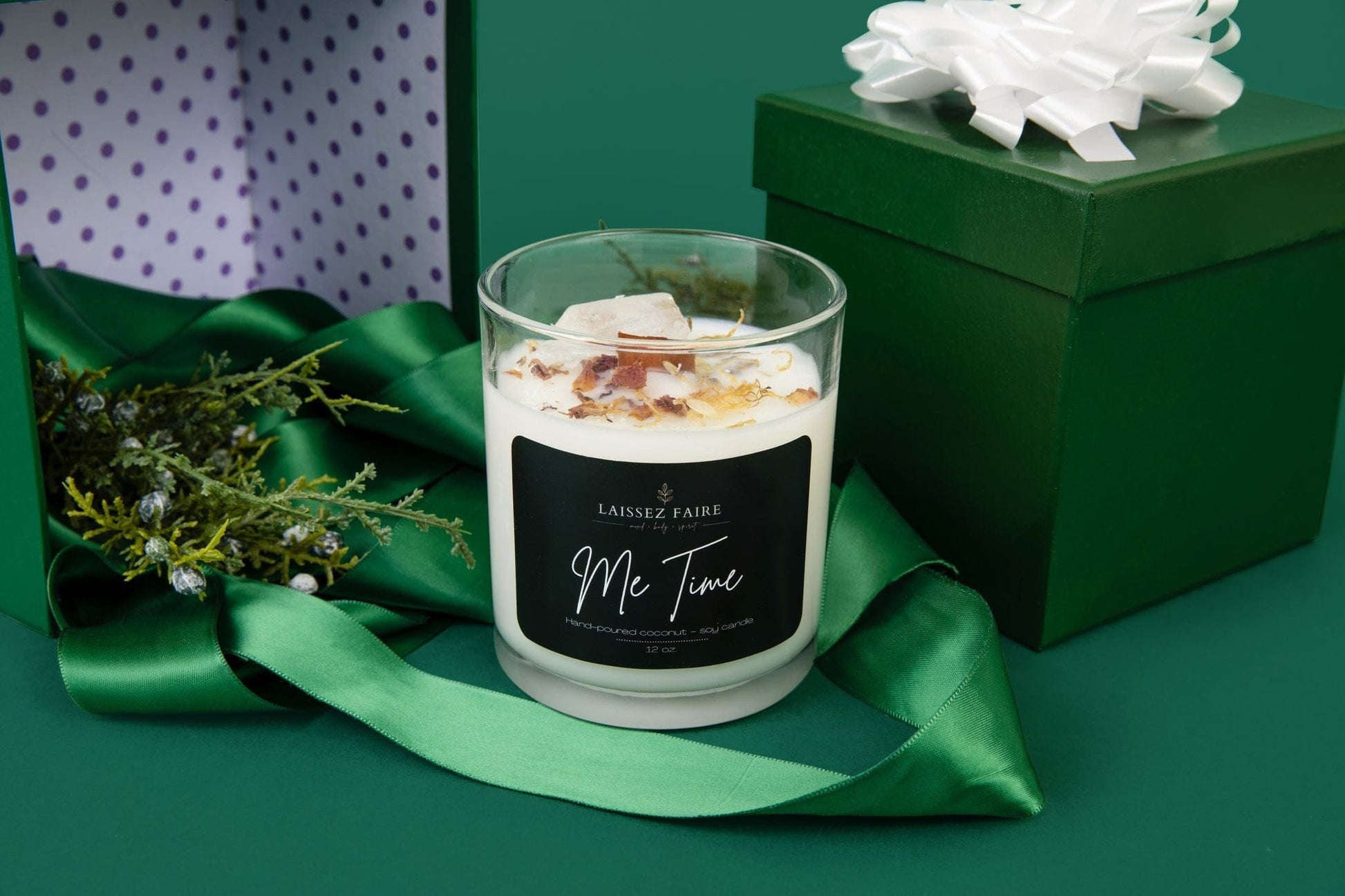 Relax to the calming light of a flickering candle. The "Me Time" candle allows you to reset and focus your energy on you! The candle contains herbs to relax your mind and body, including lavender, calendula, and rose petals. You will enjoy this lavender essential oil scented candle.