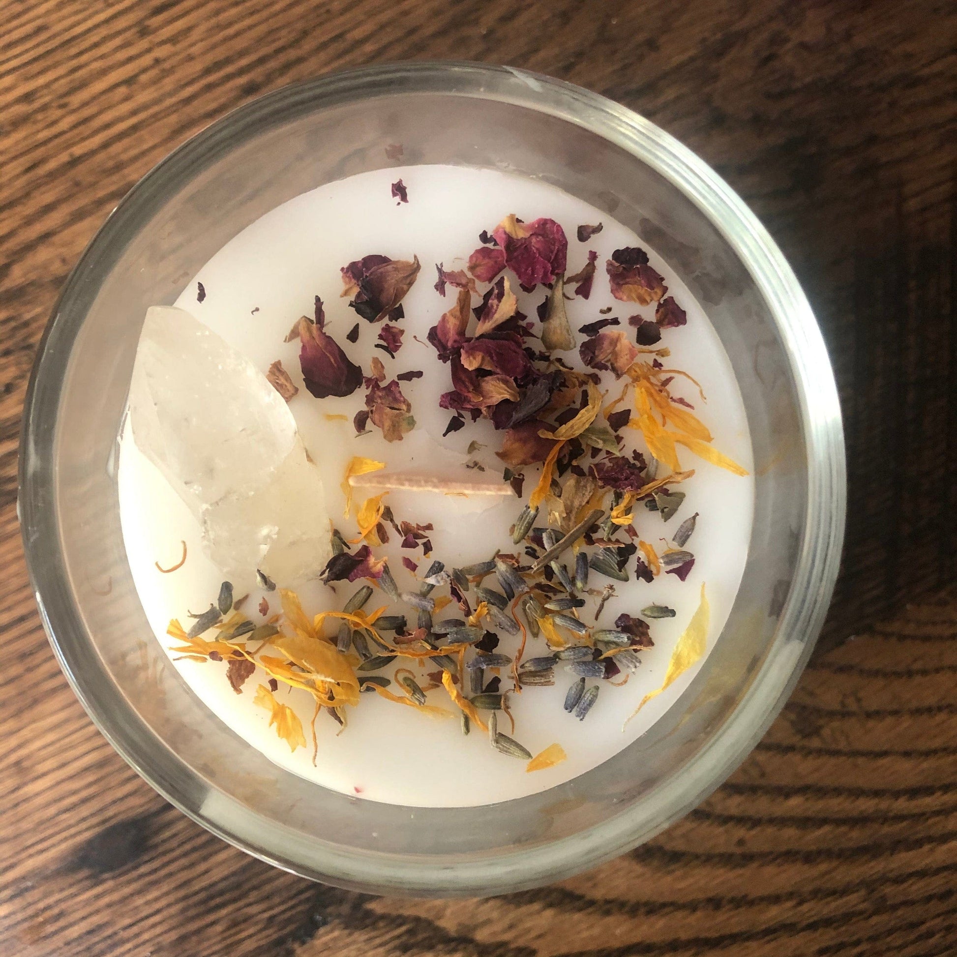 This large 12 oz. candle includes one clear quartz embedded to amplify the positive energy you will feel when you take some time to relax! Remove crystal before burning.