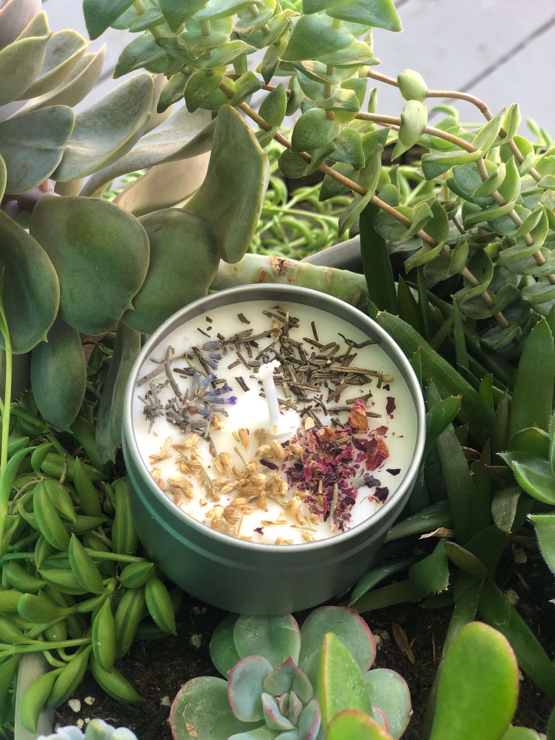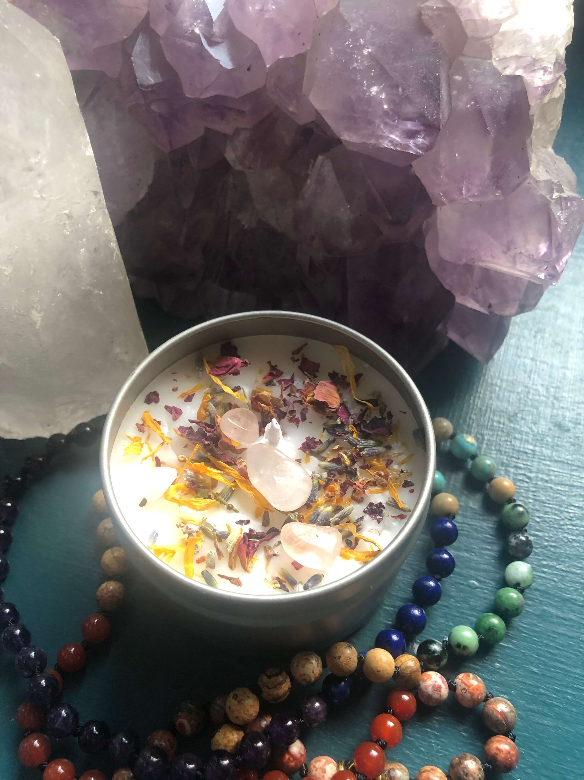 This hand-poured coconut soy blend candle comes in a small 5 oz. tin. Herbs do not need to be removed to burn candle, but will not maintain appearance once lit. Remove crystals prior to burning.