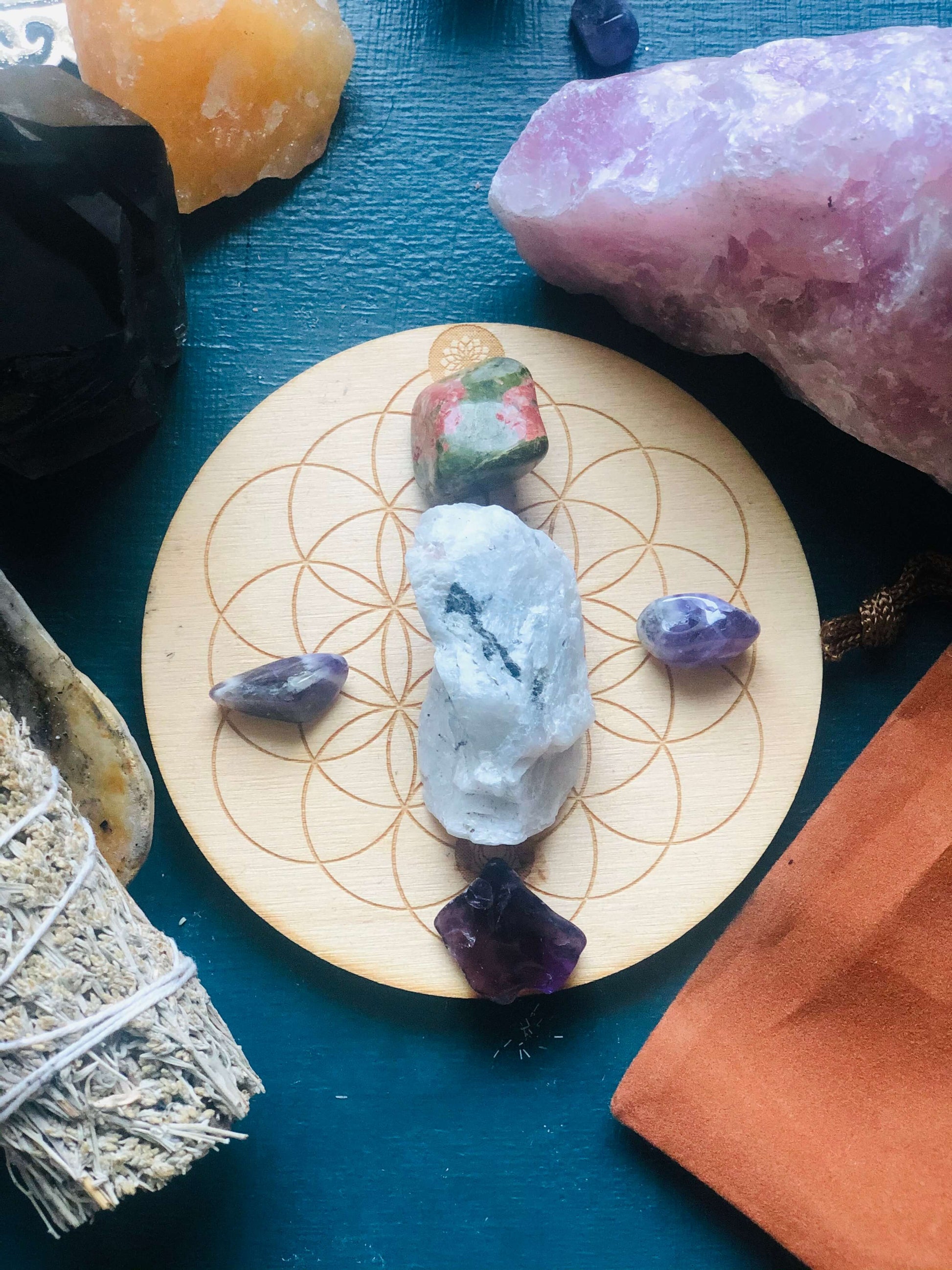 The Amethyst adds a bit of air energy to this lovely earth sign, providing a bit of go with the flow to the analytical Virgo. The Unakite assists with emotional and spiritual balance and growth. Finally, Moonstone, an ancient birthstone for Virgo, provides intuitive support.